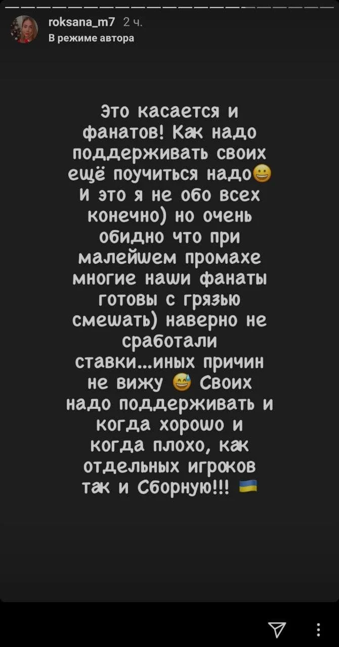 Напевно, не зіграли ставки. Інших причин не бачу. Своїх треба підтримувати і коли добре, і коли погано, як окремих гравців, так і збірну", – написала Маліновська у своєму Instagram.