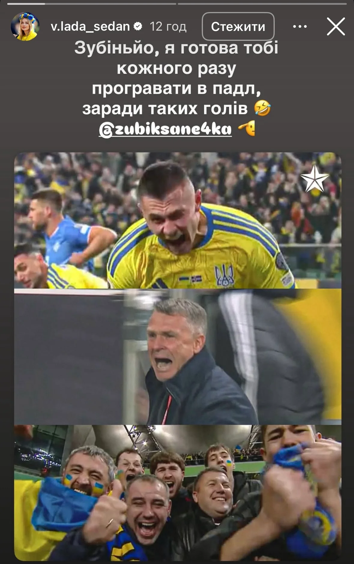 Одним із яскравих моментів стала емоційна реакція Влади Седан, дружини українського захисника Олександра Зінченка, на гол Олександра Зубкова на 83-й хвилині. Жінка буквально вибухнула радістю, відзначивши ключовий момент для "синьо-жовтих". У своїй іншій сторіс в Instagram Влада додала: "Зубіньйо, я готова тобі кожного разу програвати в падл заради таких голів".