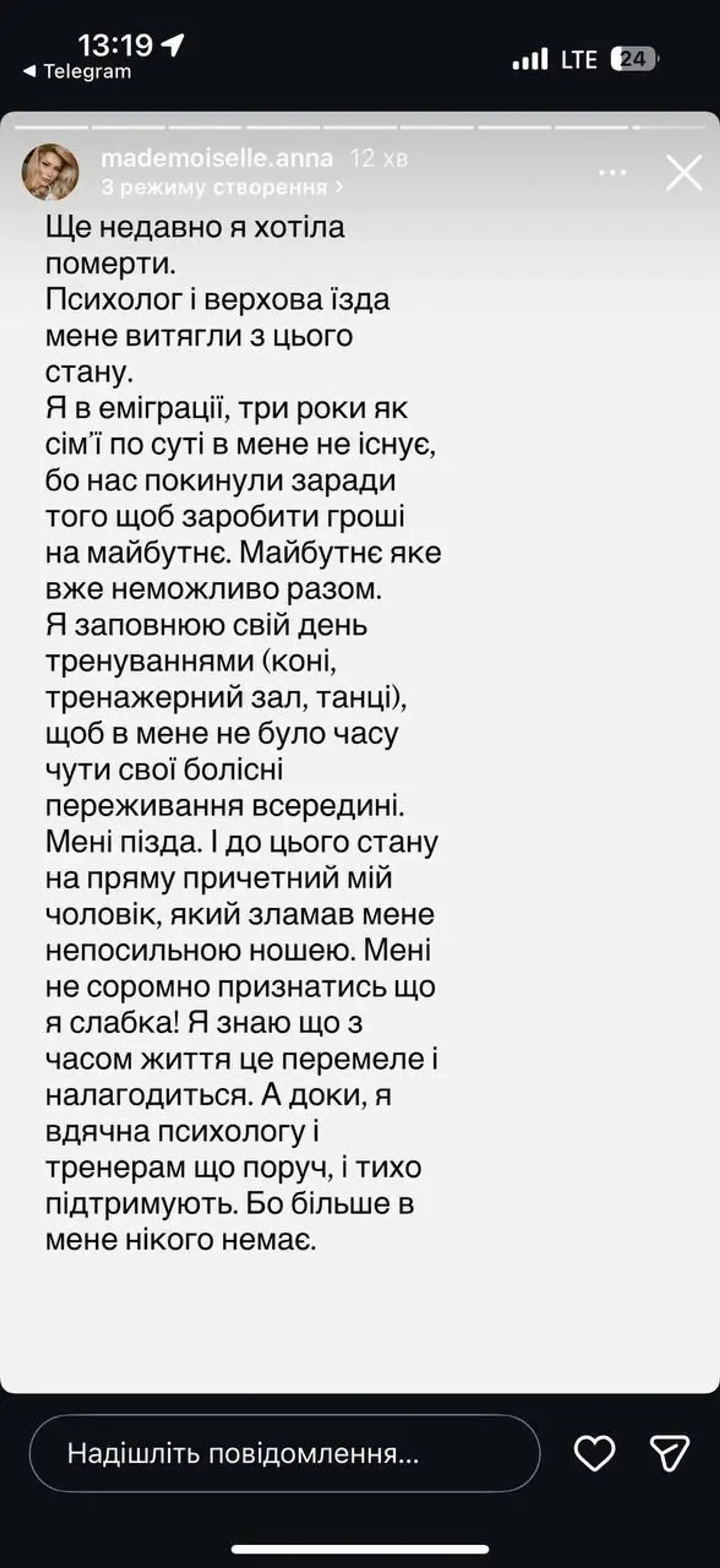 Я заповнюю свій день тренуваннями (коні, тренажерний зал, танці), щоб у мене не було часу чути свої болісні переживання всередині. Мені п**да. І до цього стану напряму причетний мій чоловік, який зламав мене непосильною ношею. Мені не соромно зізнатися, що я слабка. Я знаю, що з часом життя це перемеле і налагодиться. А поки я вдячна психологу і тренерам, що поруч і тихо підтримують. Бо більше в мене нікого немає.