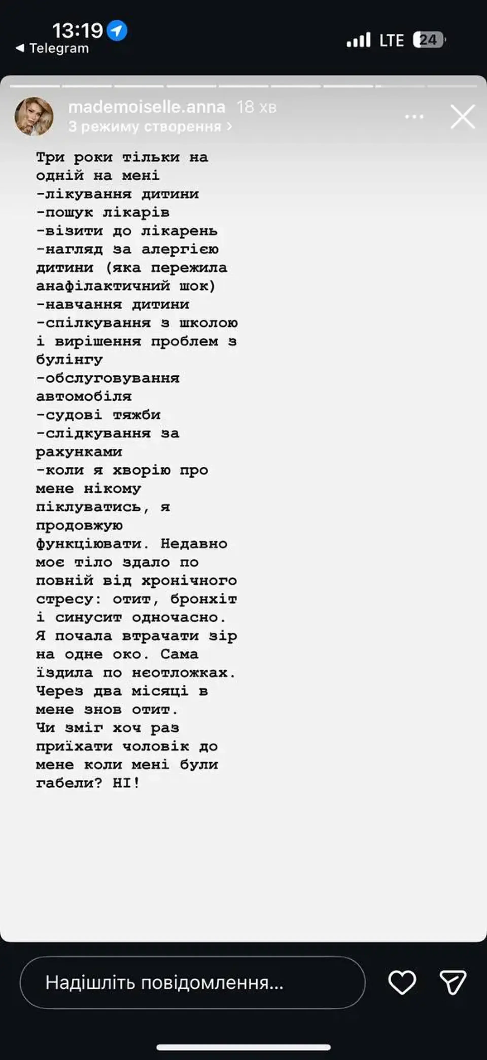 Коли я хворію, про мене нікому піклуватися – я продовжую функціонувати. Нещодавно моє тіло здало повністю від хронічного стресу: отит, бронхіт і синусит одночасно. Я почала втрачати зір на одне око. Сама їздила по невідкладних допомогах. Через два місяці в мене знову отит. Чи зміг хоч раз приїхати чоловік до мене, коли мені було геть погано? Ні", – написала Анна Зубкова у своїх соцмережах.