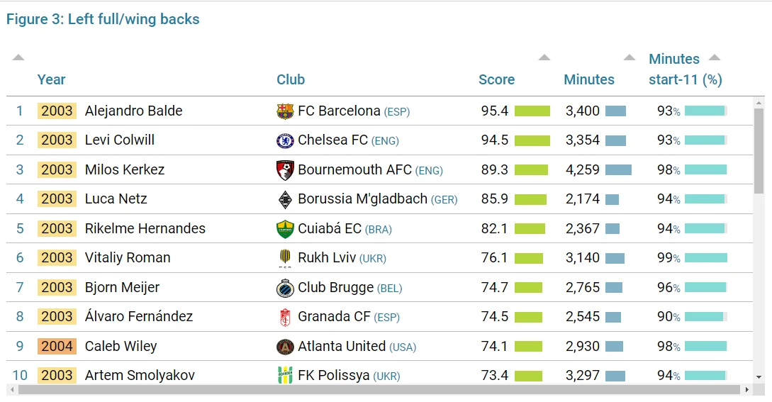 Представник Руха посів у топ-10 шосту сходинку, а оборонець Полісся став десятим. Очолив рейтинг Алехандро Бальде з Барселони. У трійку лідерів також увійшли Леві Колвілл з Челсі та Мілош Керкез з Борнмута.