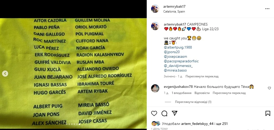 Рибак та Калашніков здобули черговий трофей у Барселоні. Хлопці стали чемпіонами Іспанії, про що повідомив сам Артем Рибак у своєму Instagram.