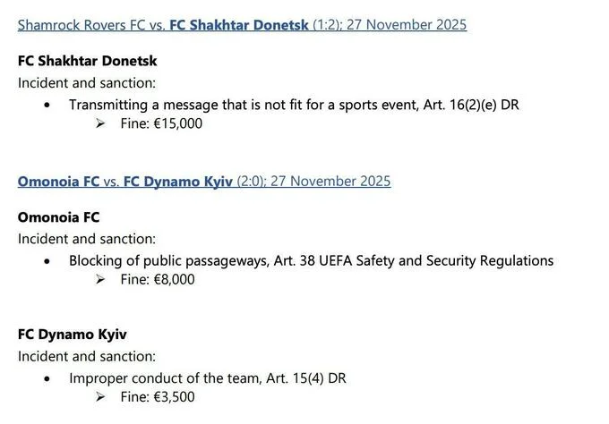 "Гірники" змушені сплатити 15 тисяч євро за "поширення повідомлення, яке є недоречним для спортивного заходу" у матчі 4-го туру Ліги конференцій проти Шемрок Роверс (2:1). Натомість Динамо оштрафували на 3500 євро "неналежну поведінку команди" у грі 4-го туру ЛК проти Омонії (0:2).