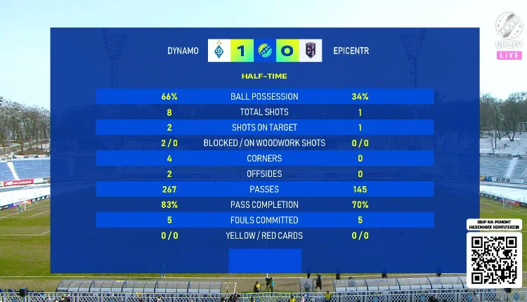 На 35 хвилину зустрічі Динамо опинилось в тій же позиції, що і з Рухом. Помітна вертикалізація все одно принесла 66% володіння, які конвертували у півтора моменти. Один із них являв собою навіс від Шапаренка, який замикав Пономаренко, але Матвій перебував у офсайді.