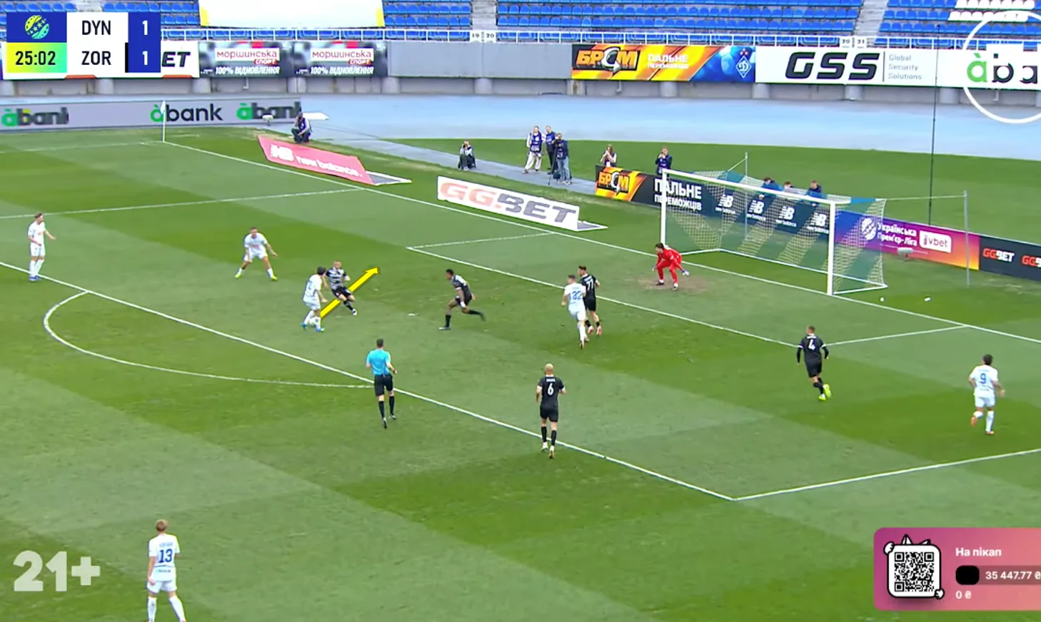 Втім, доволі смілива гра Зорі швидко вилилась у гол Динамо. На 19-й хвилині Бражко перехопив пас від Слесара й скинув м'яч Буяльському, а на Віталія висмикнувся Джордан. Капітан "біло-синіх" переж жорстким стиком встиг віддати м'яч назад на Бражка – а той побачив ривок Шапаренка й миттєво запустив розрізну передачу на хід.