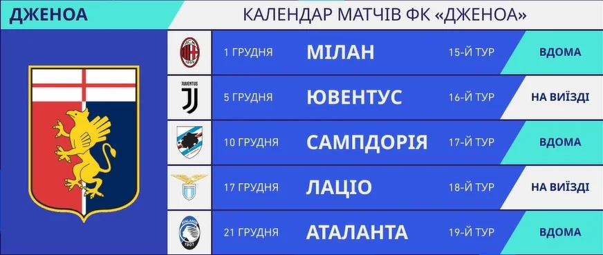 У Шевченка жахливий календар на початку кар'єри в Дженоа. Рома, Мілан, далі виїзд до Ювентуса, дербі з Сампдорією та важкі поєдинки з Лаціо й Аталантою. Всім суперникам його команда катастрофічно програє в класі. До кінця року важко розраховувати на очки.