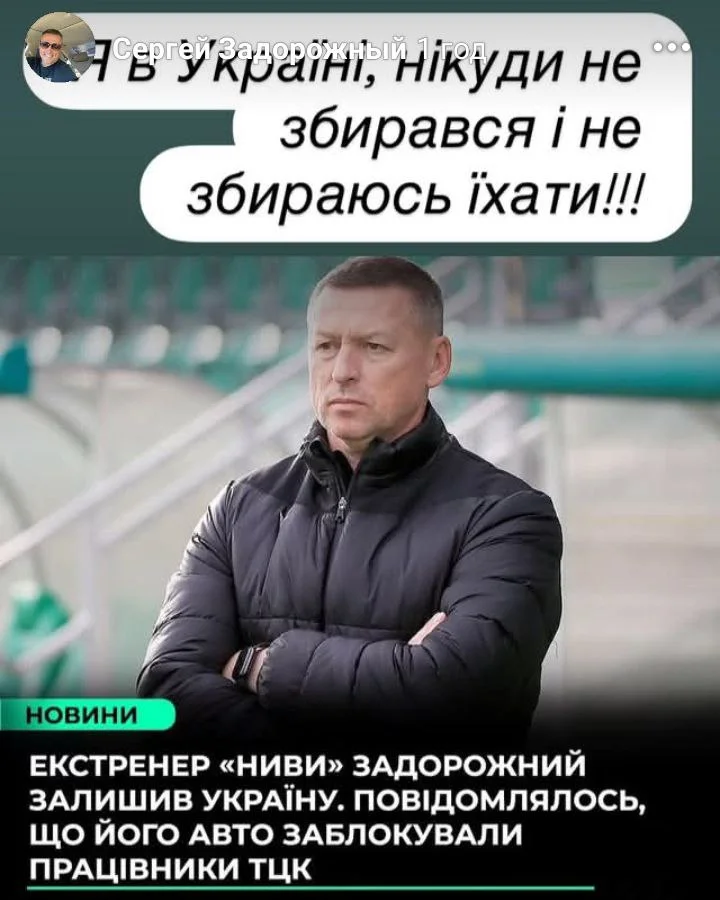 Раніше повідомлялося, що екс-футболіст понад добу не виходив з власного автомобіля, який був оточений працівниками поліції та ТЦК. Інцидент стався 12 жовтня у Тернополі. Донедавна Сергій Задорожний тренував аматорський клуб Борщів.
