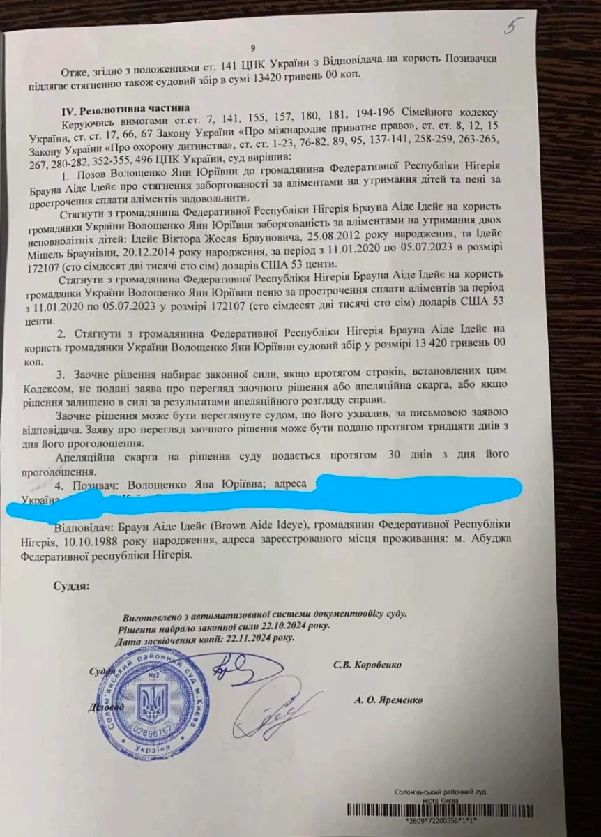 Суд зобов’язав нігерійця виплатити матері дітей, Яні Волощенко, аліменти на загальну суму 172 107,53 долара, повідомляє Sport-express.ua.