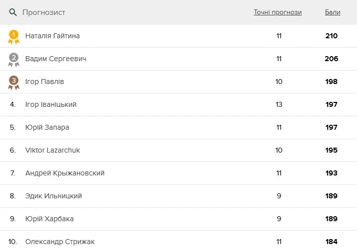 А у нас тут непересічна подія! Вперше в історії оновленого конкурсу прогнозів чемпіонкою тижня стала жінка! Наталія Гайтина із села Зоря, що в Рівненській області, набрала 211 балів – цього вистачило для призового "золота". На чотири очки від пані Наталії відстав юзер Вадим Сергеевич, який поки що не вказав адреси у своєму профілі. "Бронза" – в Ігоря Павліва з смт Брошнів-Осада, Калуський район, Івано-Франківська область (198 очок).