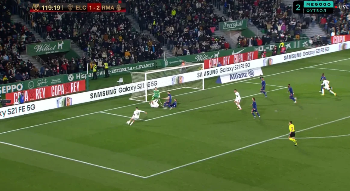 Не можна сказати, що цей гол вивів господарів з рівноваги. Мадридці після забитого м'яча нічого не створювали, однак на 116-й хвилині взнаки далася різниця в класі. Алаба з флангу запустив передачу за спини захисникам на хід Азару, а голкіпер Ельче – Вернер – несподівано вийшов далеко з воріт аж на фланг. Еден спокійно скористався цим подарунком, обігравши Акселя й пробивши у порожні. 1:2!
