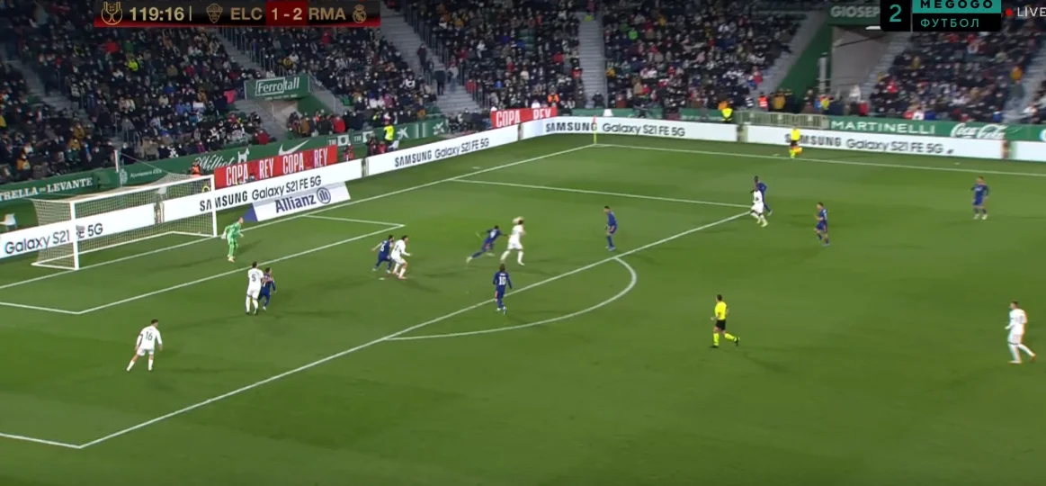 Перший овертайм завершився саме з цим рахунком, однак щастя Ельче тривало недовго. Всього через дві хвилини після міні-перерви Реал відновив статус-кво: Каземіро увійшов на лівий край карного майданчика й покотив під удар Себальйосу, а Іско, уникнувши офсайду, підправив доволі кривий постріл Дані у протилежний кут – 1:1!