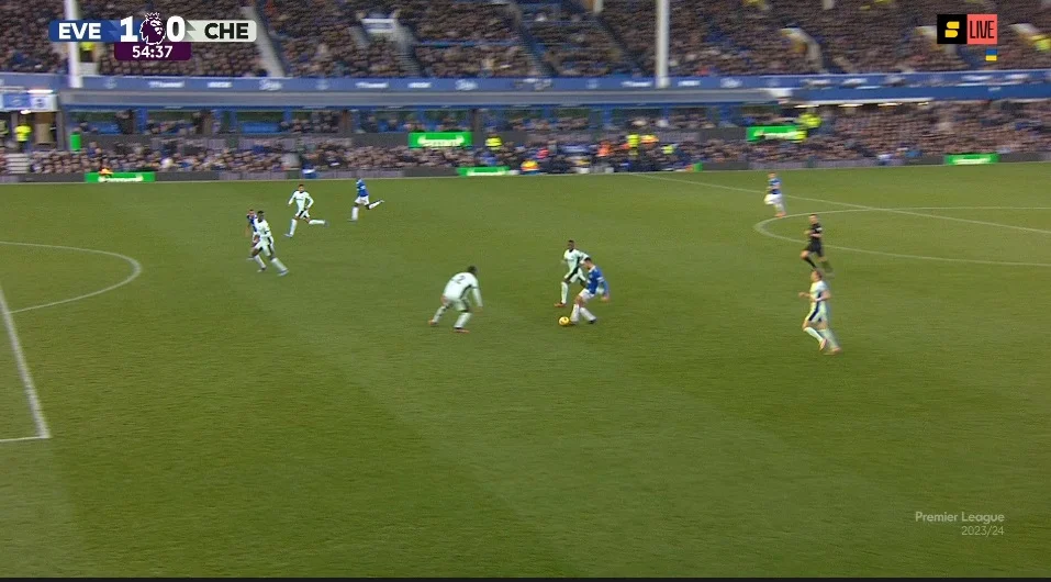 На третій хвилині Мудрик вперше отримав м'яч у штрафному. Вінгер збірної України випередив 38-річного Ешлі Янга і одразу ж міг стати автором асисту. Михайло покотив на Енцо Фернандеса, удар якого відбив Джордан Пікфорд. Добивання аргентинця було невдалим. Перший момент у матчі. Тут же Михайло вдало зіграв у відборі, повернувши м'яч на чужій половині. Частіше атакував Челсі саме лівим флангом, куди, окрім Мудрика, також зміщувався Енцо і підключався Кукурелья. Українська "десятка" Челсі подачею з кутового знайшов голову Бадіашиля – той пробив неточно. У Евертона на старті гри можна згадати хіба що невдалий простріл із правого флангу, на який не встиг Калверт-Льюїн. Вперед "іриски" практично не ходили.