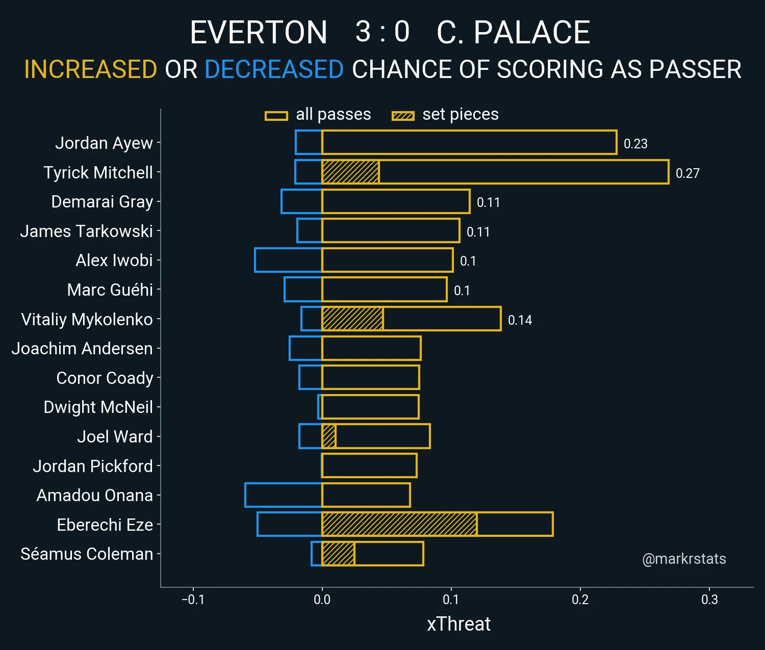 Водночас компенсував загалом надійною грою в обороні, майже не помітив 4 агресивних атак різних суперників, які більше підходили бійцівському клубові, і зробив нарешті якісно те, про що благали всі фанати Евертона. Кілька підключень до атаки стали прелюдією результативної комбінації, де допоміг остаточно розірвати рештки оборони "орлів". Крім того, поступився лише Айю і Мітчеллу за гостротою пасів, які наближали шанс забити (0,14 xThreat). Навіть в головного асистента і гравця матчу Івобі виявилося менше подібних дій. Евертон після кількох провальних матчів проти суперників із актуального топ-6 турнірної таблиці також зумів позитивно здивувати.