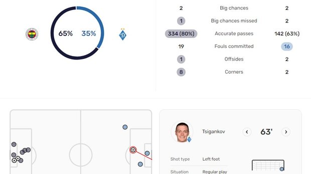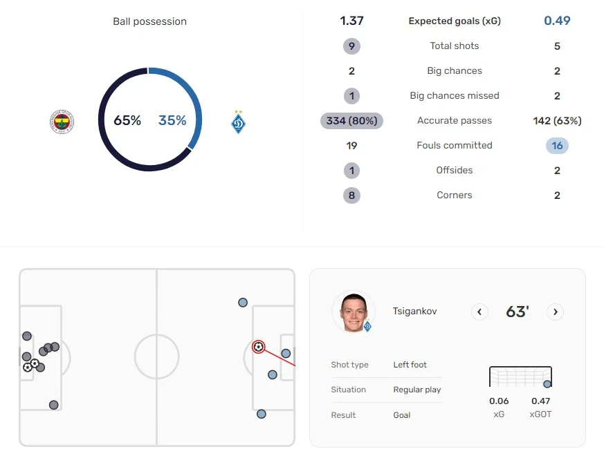 Матч на 3 результати програно. Не могло динамівцям постійно таланити у протистояннях з Фенербахче. Сьогодні цілком був шанс вирвати щасливий квиток і навіть перемогти. За стовідсотковими моментами OPTA показує паритет 2:2. Статистика очікуваних голів віддає перемогу Фенербахче, але там багато вирішили 4 удари на стандартах у межах воротарського майданчика. Кияни створили магію з гри. Буяльський навіть після жахливого пасу Кабаєва у спину вирулив, обігравши двох суперників і знайшовши Циганкова. Міг Віталій і сам забити після подачі зі штрафного. Хоча загалом позиційна атака Динамо також викликала чимало запитань. Однак тут треба розуміти, що створити щось нині з гри здатні по суті лише двоє.