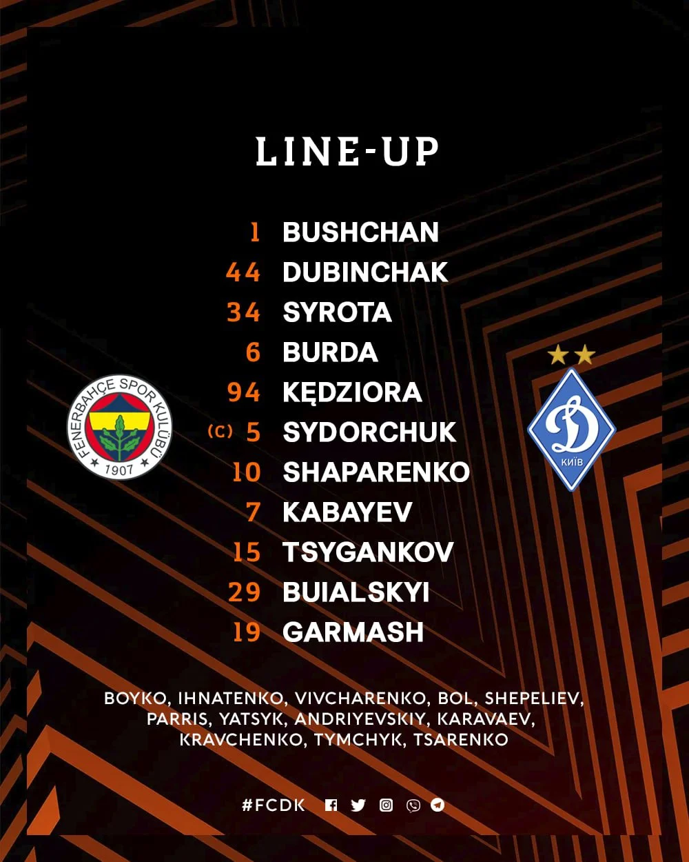 Луческу несподівано залишився без обох наявних нападників. Бєсєдін і Ванат летіли у Стамбул, але до заявки не потрапили через травми. Також дивує поява Микити Бурди, який не грав офіційних матчів 2 роки і майже 2 місяці, замість Іллі Забарного в центрі захисту. Останній теж не у складі, хоча готувався до гри ще кілька днів тому. В запасі киян починає ямайський новачок Кахім Перріс.