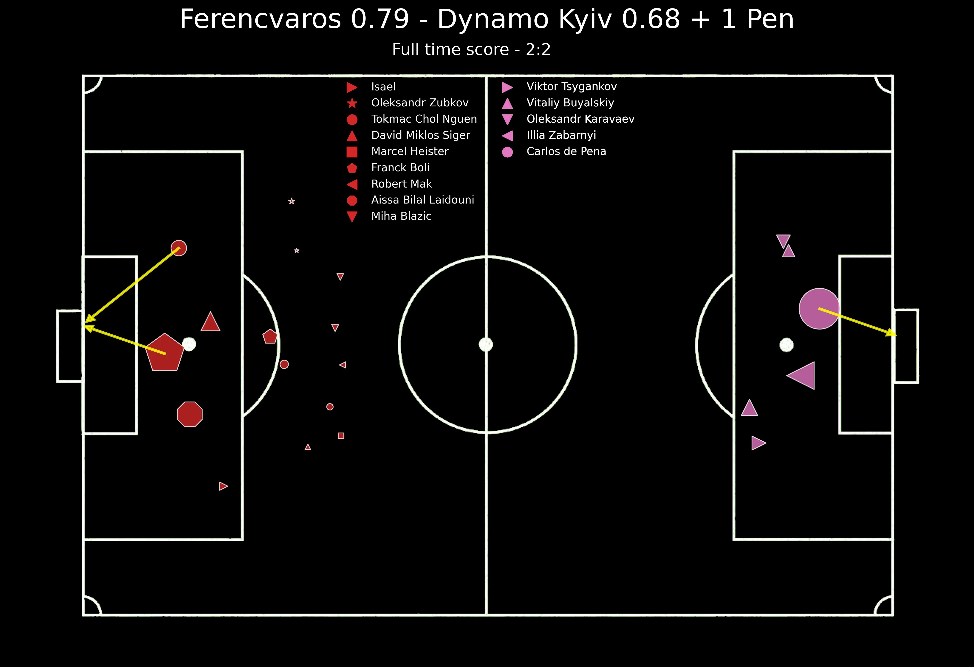 Кендзьора пасував на Забарного, який заробив пенальті. А на 41 хвилині оформив своєрідний дубль. Томаш видав розкішний передгольовий пас на Буяльського, який розірвав офсайдну пастку і віддав на порожні ворота для Де Пени. Захист Динамо нині просто божественний... в атаці! Та ще й Де Пена, ледь не найгірший з Ювентусом, дуже круто виглядає. Ну, а атакувальні хавбеки збірної України своїм високим класом давно вже уважного глядача не дивують. Двічі дістається Попову. Ференцварош найбільше запам'ятався своєю грубістю, одного генія Нгуена зовсім недостатньо.