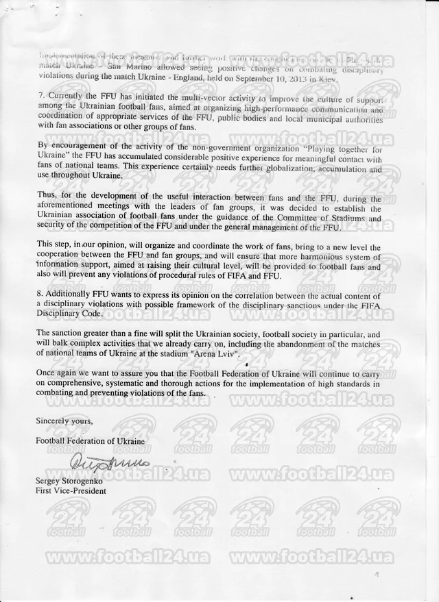 Це випливає з документу, копія якого є в розпорядженні сайту "Футбол 24". Під час процедури дисциплінарного провадження з приводу інцидентів під час матчу між збірними України та Сан-Марино, який відбувся 6 вересня на "Арені Львів", Стороженко звернувся до дисциплінарного комітету FIFA з проханням покарати “Арену Львів”. В листі від 17 вересня 2013 року в пункті 4 мова йде про наступне: