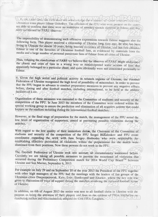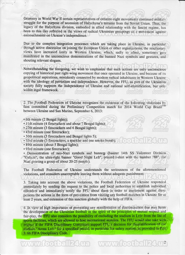 "З урахуванням можливості запобігання будь-яким проявам дискримінації, що можуть завдати шкоди розвитку всього українського футболу у дусі дотримання принципів взаємоповаги та fair-play, ФФУ також розглядає можливість виключення стадіону у Львові з переліку спортивних споруд, на яких дозволено проведення міжнародних матчів. ФФУ також з розумінням поставиться до того, що Дисциплінарний комітет FIFA підтримає рішення ФФУ про дискваліфікацію стадіону "Арена Львів" на визначений строк, зокрема, з міркувань безпеки, як це передбачено ч.3 ст. 66 Дисциплінарного кодексу FIFA".