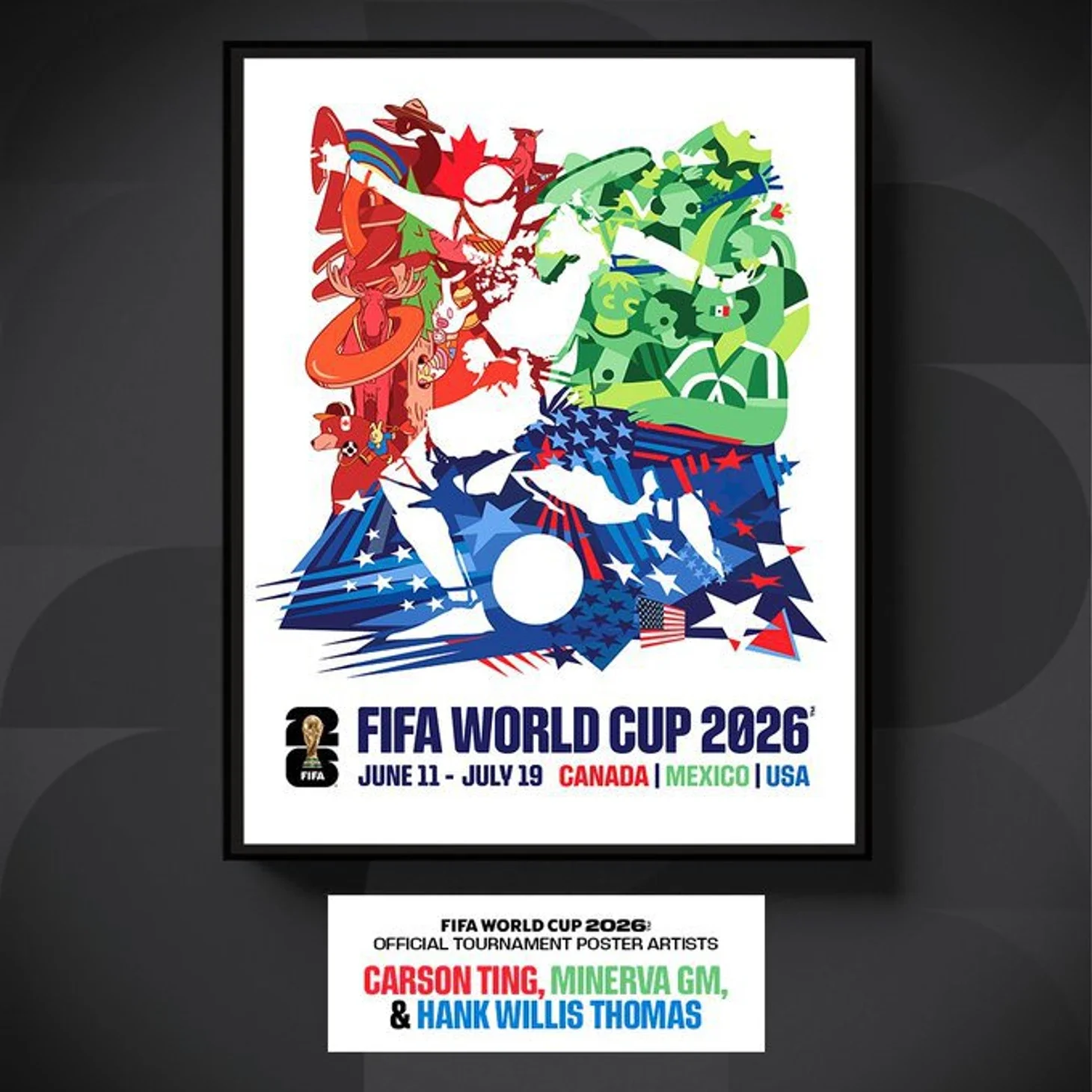 Вперше в історії чемпіонатів світу три художники об'єднали свої зусилля для створення офіційного постера турніру ФІФА. Художники Карсон Тінг (Канада), Мінерва GM (Мексика) і Хенк Вілліс Томас (США) об'єднали свої таланти і художні стилі, щоб створити твір, який демонструє, як спільна пристрасть до футболу об'єднує світ", – йдеться в повідомленні ФІФА.