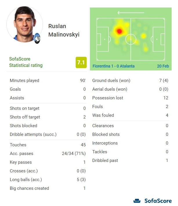 Маліновський отримав другу найкращу оцінку в Аталанті від SofaScore – 7.1.