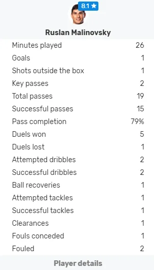 ...і не тільки. У Руслана найвищий бал серед усіх гравців матчу за версіями таких статистичних порталів, як SofaScore (7,6) і FotMob (8,1). Whoscored поставив лише Ілічічу вищу оцінку (7,81), та й то на крихітні 0,07. Українець встиг виконати операцію "стати гравцем матчу за 26 хвилин". Крім його фірмового забитого м'яча (відкрився між лініями, ідеально відчув простір по центру, увірвався у нього і пробив максимально вчасно та незручно для воротаря), екс-гравець Зорі двічі мав ставати асистентом. Паси на Гомеса та Сапату не перетворилися в гольові, але допомогли аргентинцю з колумбійцем вирватися на ударні позиції в межах штрафного.