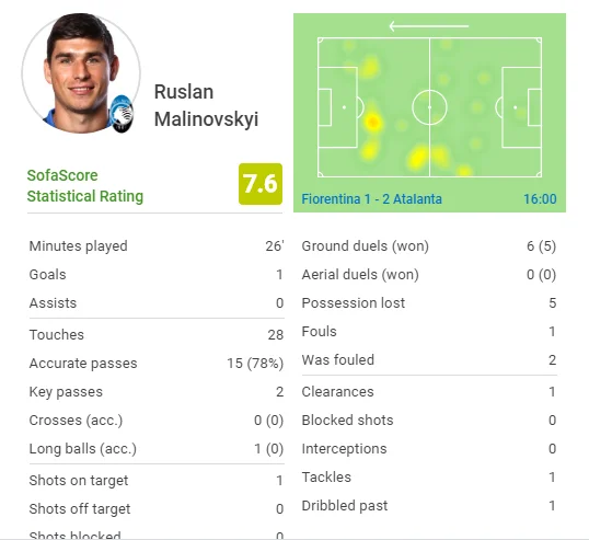 А ще була стовідсоткова успішність у дриблінгу (2 з 2) та відборі (1 плюс одне відновлення володіння), а також більше точних пасів (15), ніж разом в усіх трьох форвардів Фіорентини, які виходили нині на поле. Маліновський виграв 5 єдиноборств з 6, заробив на собі 2 фоли, ще 1 раз виносив м'яч, підчищаючи поблизу своїх воріт. Зіграв максимально зібрано та обережно (лише 5 втрат стали найкращим результатом для польових бергамасків).
