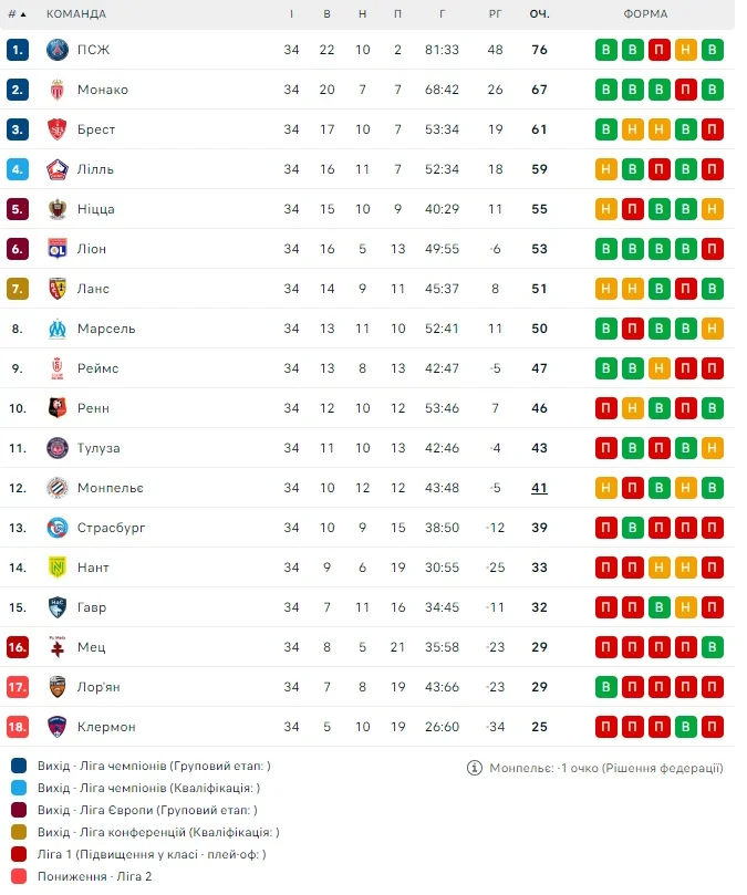 Всі результати 34-го туру Ліги 1 (скрін з Flashscore):