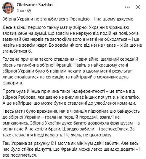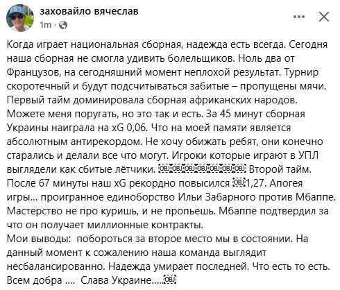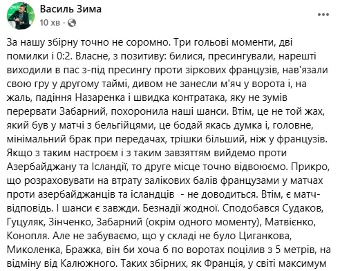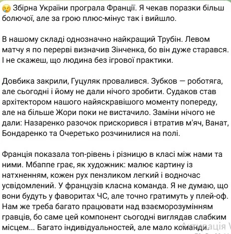 "Футбол 24" зібрав відгуки експертів та вболівальників на матч першого туру відбіркового циклу ЧС-2026 Україна – Франція (0:2).