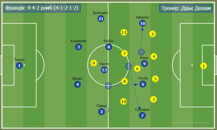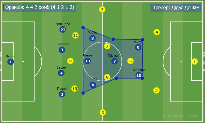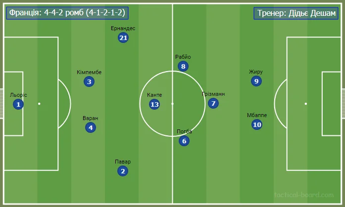 На схемі – найоптимальніший варіант складу, але враховуючи дуже багатий вибір сильних кандидатів на кожну позицію, не факт, що саме у такому поєднанні на матч з Україною вийдуть французи. Наприклад, перед від'їздом до табору національної команди, ушкодження отримав Мбаппе. На момент підготовки матеріалу, його участь у матчі з Україною була під питанням. Проте на кожну позицію у Дешама є виконавці, якщо не з ідентичними, то схожими техніко-тактичними характеристиками. Тому склад у наших схемах не має особливого значення, головне – позиції та ролі.
