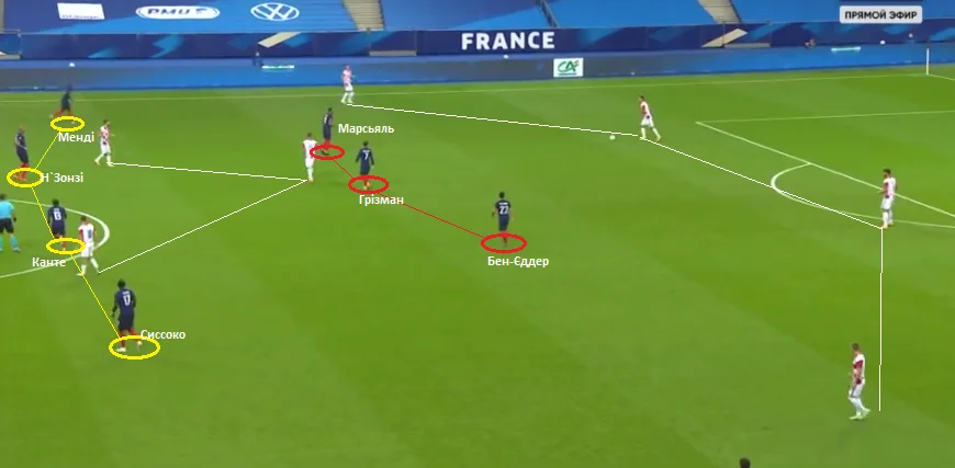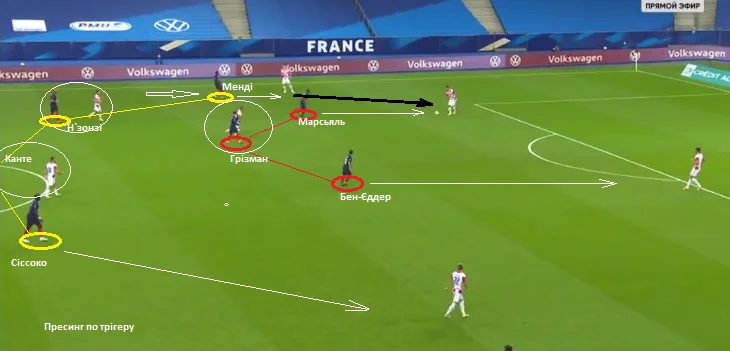 Французи не використовували системний інтенсивний тиск, але змушували віце-чемпіонів світу відмовлятися від розіграшу та починати свої позиційні атаки довгими передачами.