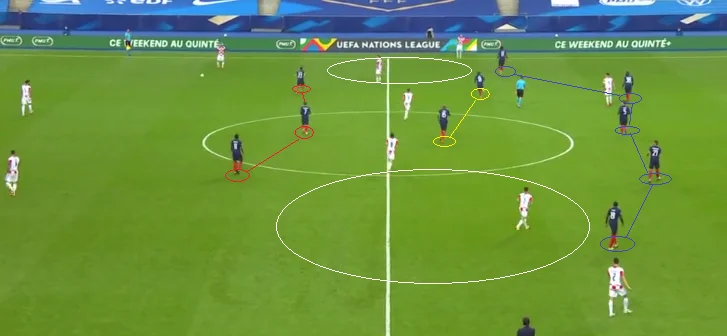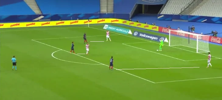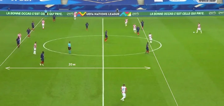 Крім цього, треба самим ефективно користуватися вертикальною компактністю суперника. Команда Дешама, наче Шахтар, не тисне на центрбеків та дозволяє робити закидання, тримаючи при цьому достатньо високу лінію оборони. Часто глибина середньго блоку Франціїї складає близько двадцяти метрів.