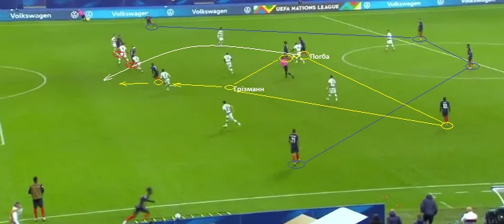 На схемі вище – приклад схожої ігрової ситуації. Лівий фулбек вільно отримує м'яч на бровці і відразу потрапляє під тиск умовного Погба. Паралельно з хавбеком МЮ до флангу синхронно зміщується уся лінія з трьох гравців – Погба, Канте, Рабйо. Ця структура чудово підходить під 4-1-4-1 суперника, за якою грає Україна. Погба тисне на фулбека, а Канте і Рабйо накривають "вісімок". Грізманн тримає опорного, форварди контролюють центрбеків.