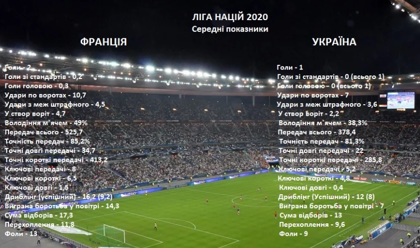 Пропоную порівняти статистичні показники збірних Франції і України у Лізі Націй. Враховуючи, що наша національна команда провела на один матч менш , беремо до уваги середній показник.