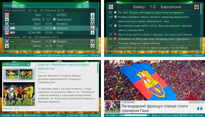 А це оперативні відеорепортажі, новини, турнірні таблиці та календар матчів. Вся інформація зручно представлена у трьох основних розділах, які в свою чергу, діляться на чемпіонати. Додаток має продуманий інтерфейс, навігація здійснюється з легкістю за допомогою телевізійного пульта.