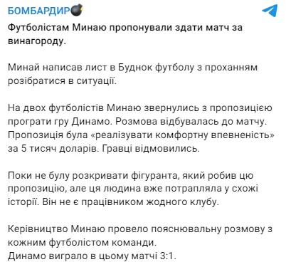 Двоє гравців Миная отримали пропозицію здати гру з Динамо, повідомляє Telegram-канал "Бомбардир".