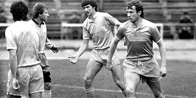 Тренер Ростислав Поточняк, старший тренер Борис Рассихін та начальник Карпат Ігор Кульчицький у 1989 році / Фото В. Дубаса