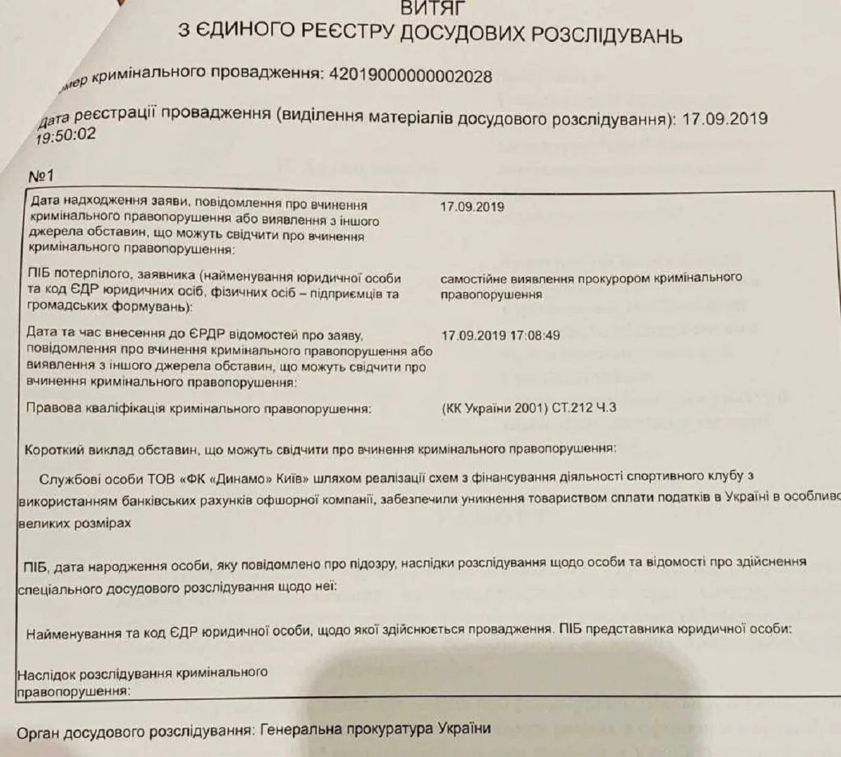 Генеральна прокуратура України (ГПУ) відкрила кримінальне провадження за фактом ухиляння від сплати податків в особливо великих розмірах службовими особами ТОВ ФК Динамо Київ, повідомляє Dt.ua. Мова йде про кримінальне провадження № 42019000000002028, зареєстроване 17 вересня 2019 року в Єдиному реєстрі досудових розслідувань.