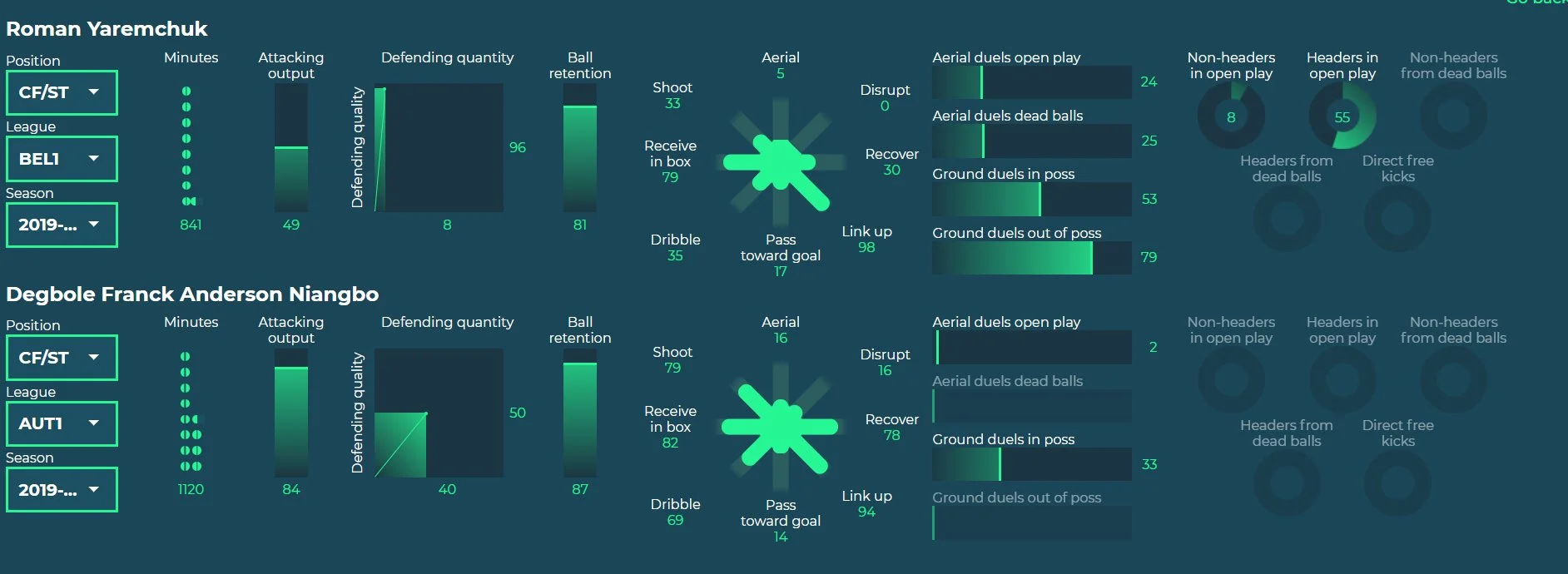 У результативності Ніангбо поступається Яремчуку. Наш форвард настріляв 17 голів за 30 матчів цього сезону в усіх турнірах, а новоспечений конкурент – 7 голів за 25 матчів. При цьому івуарієць частіше б'є по воротах, частіше йде в обіграш і більше відпрацьовує без м'яча. Зі своїм зростом (на 19 сантиметрів нижчий за Романа) мобільніший, але гірше грає на другому поверсі.