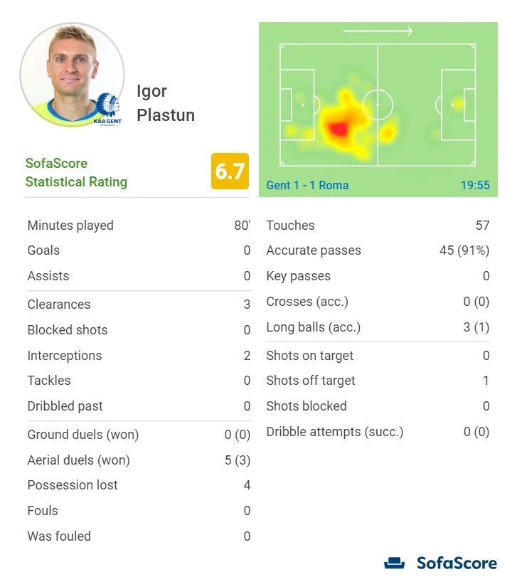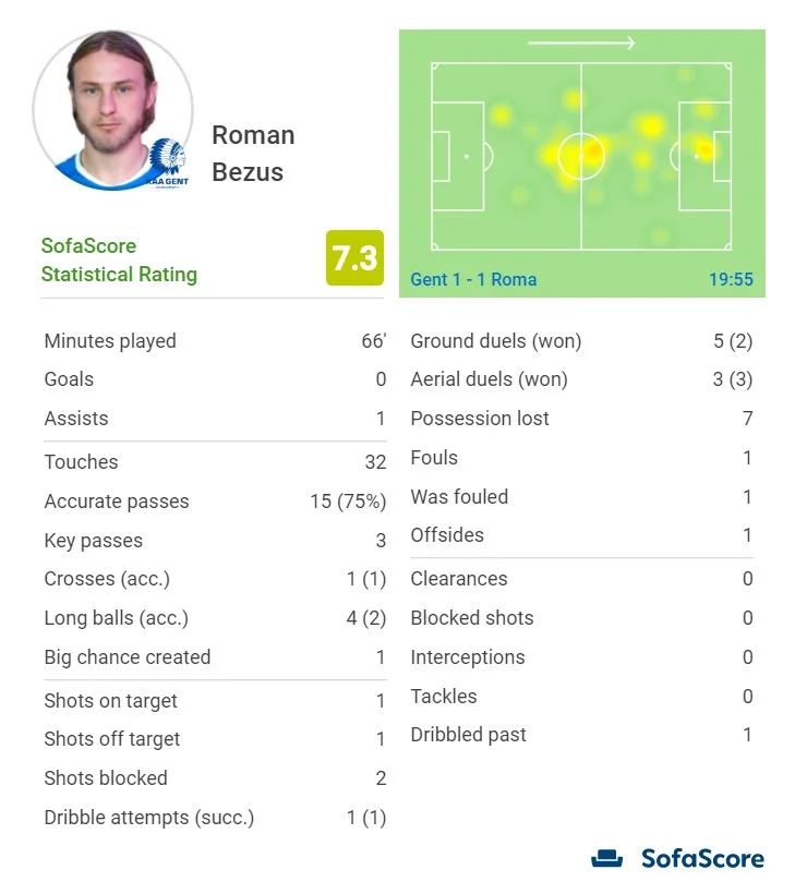 Безус виглядав одним з найактивніших на полі – 3 ключові передачі. Під час пресингу підіймався на одну лінію з форвардами, відпрацьовував назад, отримав жовту за спробу зірвати гостру контратаку фолом на Мхітаряні. Гент діяв з позиції сили, а Роман постійно пропонував себе партнерам, опускався на власну половину, допомагаючи з просуванням м'яча.