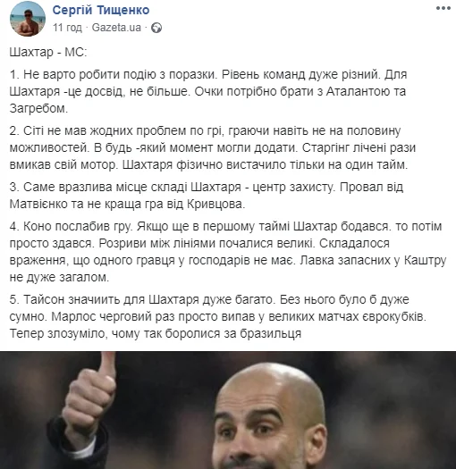 Блогер "Футбол 24" та інших видань Сергій Тищенко гадає, що не варто робити глобальні висновки з поразки, адже "рівень команд дуже різний. Очки потрібно брати з Аталантою та Загребом. Сіті не мав жодних проблем по грі, граючи навіть не на половину можливостей. Шахтаря фізично вистачило тільки на один тайм. Найвразливіше місце у складі – центр захисту. Провал від Матвієнка та не найкраща гра від Кривцова".