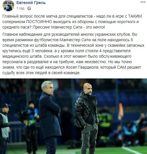 Аналітик молодіжної збірної України Євген Гресь має головне питання після матчу для фахівців: "Чи треба в грі з ТАКИМ суперником ПОСТІЙНО виходити з оборони за допомогою короткого і середнього пасу? Пресинг Манчестер Сіті – це щось! Головне спостереження для керівників багатьох українських клубів. Під час розминки футболістів Манчестер Сіті на полі перебувало 8 фахівців зі штабу команди.