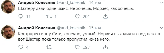 Вболівальник Динамо, журналіст видання "Футбол" Андрій Шахов вважає, що Ман Сіті може здобути в цій групі 6 перемог, а отже, після фіаско Аталанти шанси Шахтаря – хороші. Хоча "пролетіли зі свистом. Очікувано. 0:3 при двох стійках з одним ударом у ворота не залишають питань, хто сильніший, хто класніший".