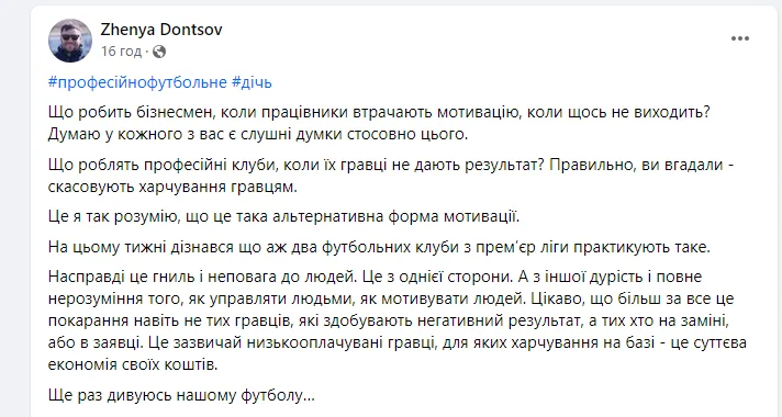 Цікаво, що найбільше це покарання зачіпає навіть не тих гравців, які здобувають негативний результат, а тих, хто на заміні або в заявці. Це, зазвичай, низькооплачувані гравці, для яких харчування на базі – це суттєва економія своїх коштів", – написав Донцов на своїй сторінці у соціальній мережі Facebook.
