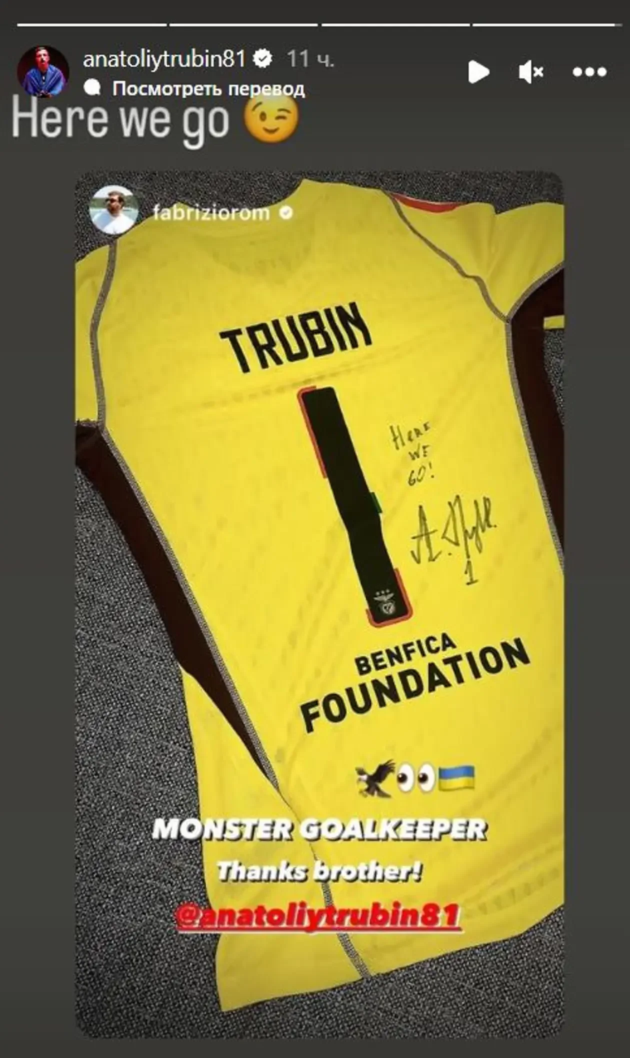 Фото презенту журналіст виклав на своїй сторінці у соціальній мережі Instagram, підписавши: "Голкіпер-монстр. Дякую, брате!". Трубін зробив перепост, додавши вже культову фразу "Here we go", яку Романо використовує при інсайдах трансферів.