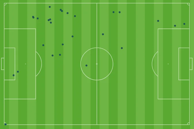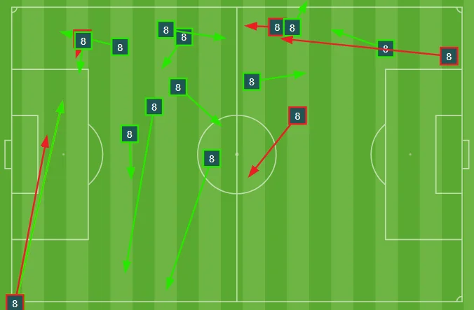 Карта пасів досить неоднозначна. Ніби й маємо великий обсяг роботи на чужій половині, а ніби й немає суттєвих просувань для партнерів. Тільки одна з двох прогресивних передач українця виявилась точною.