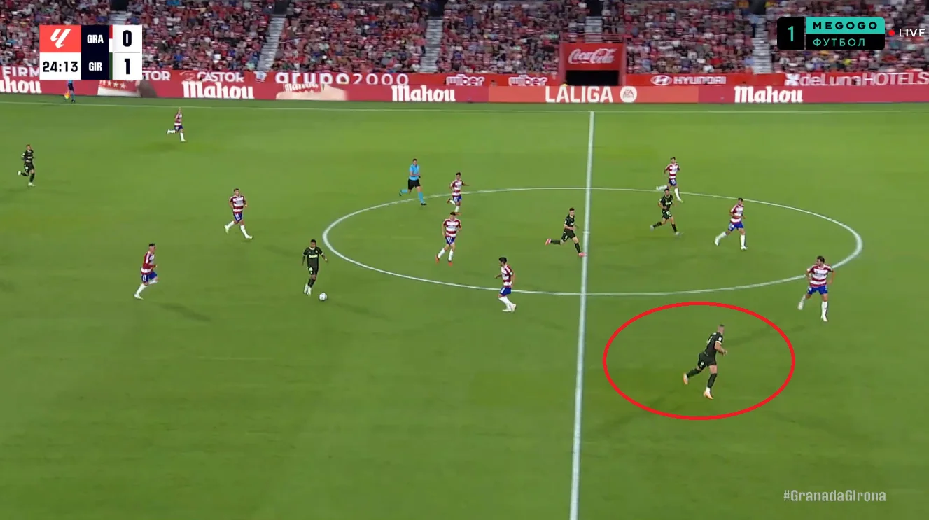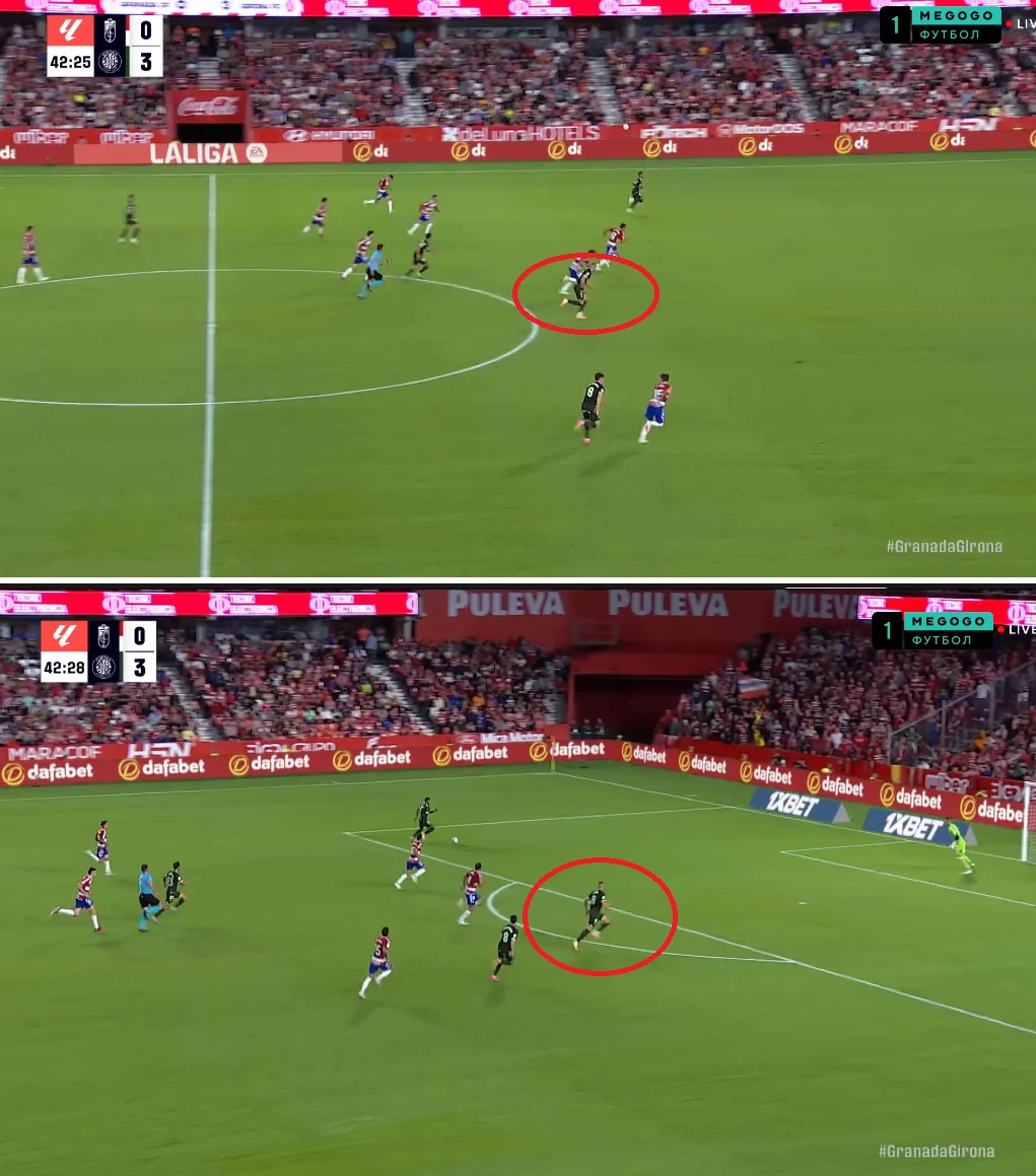 А тут Артем відкрився праворуч, протягнув м'яч крізь фланг і скинув його на Коуту, після чого Жирона заробила штрафний.