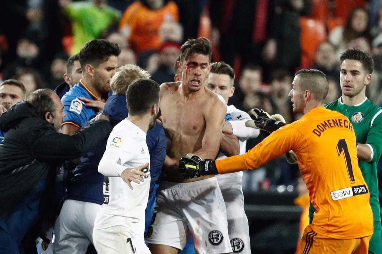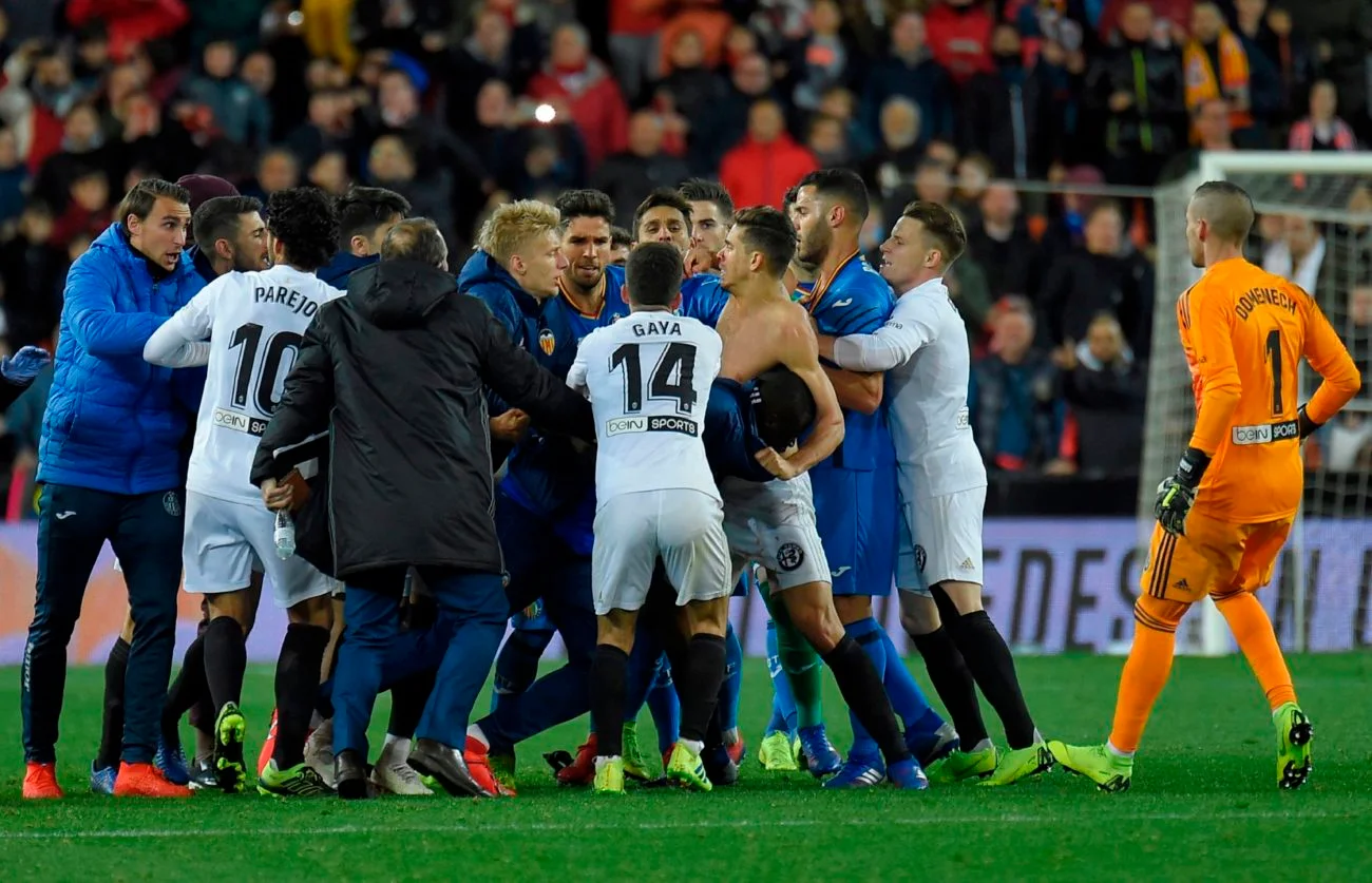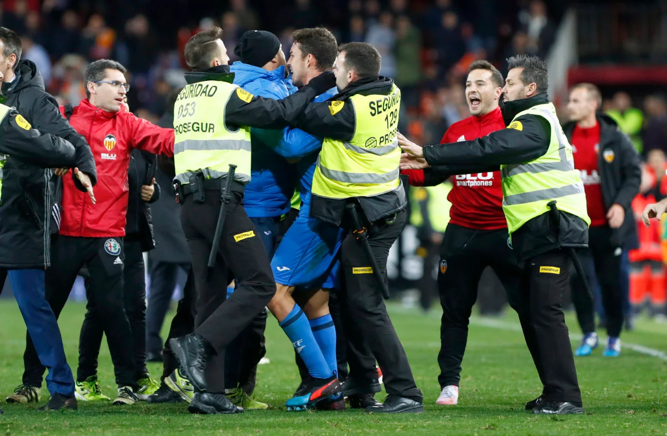 Вибухова суміш ейфорії та люті спровокувала великий хаос. Леандро Кабрера і Муктар Діакабі проривають живий кордон зі стюардів, щоб нагородити один одного декількома стусанами. Леандро Чічісола шарпається з представником безпеки стадіону, а позаду нього закривавлений Пауліста вигукує щось на зразок "тримайте мене семеро". Тим часом екс-динамівець Антунеш безпорадно намагається заспокоювати своїх та чужих. Поволі, все набуває вигляду типових дворових розбірок – "стіна на стіну". Ой, ми ледь не забули про фанатів. На фоні цього божевілля уболівальники Валенсії нещадно проклинають гравців Хетафе.