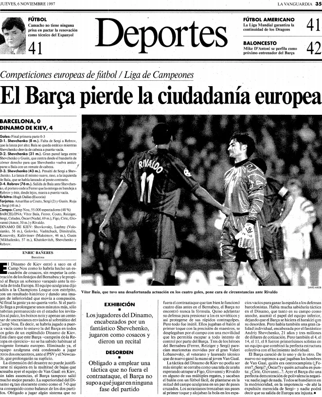22 роки тому київське Динамо здобуло одну з найкрасивіших перемог у власній історії, розбивши Барселону на Камп Ноу з рахунком 4:0. "Футбол 24" обрав найсильніші цитати каталонського видання La Vanguardia, яке знищувало команду Луї ван Гала наступного дня.