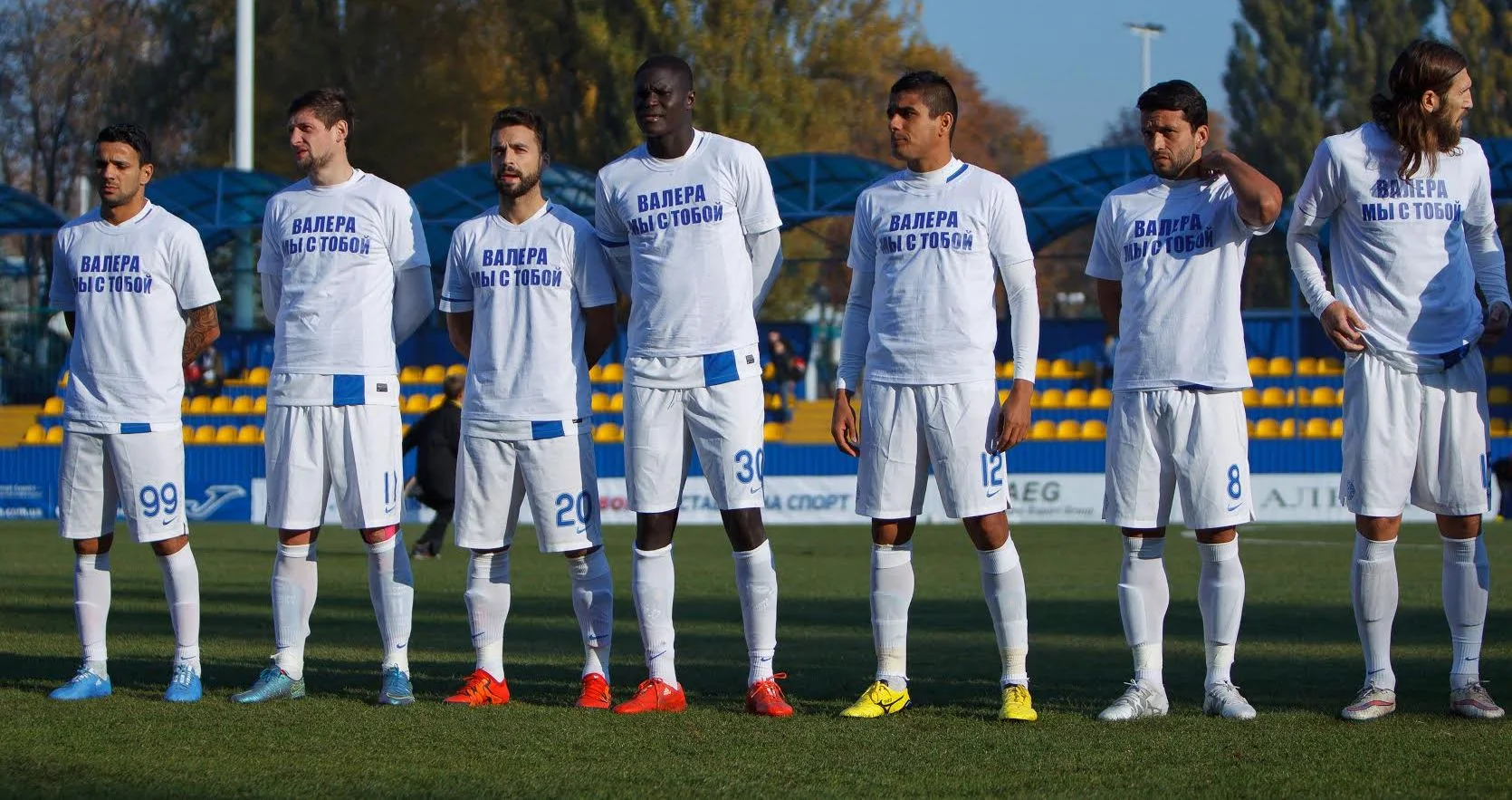 Напис на футболках був "Валєра, ми з тобою!". На спині у кожної з них був 25-й номер, під яким грає Федорчук. Нагадаємо, що півзахисник "Дніпра" нещодавно отримав травму та переніс операцію.