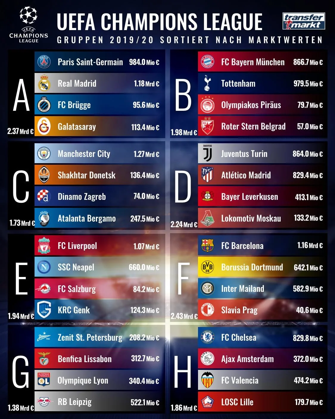 Ця група посіла передостаннє місце у загальному рейтингу. Нижче лише квартет, де гратимуть Зеніт, Бенфіка, Ліон та РБ Лейпциг. Загальна вартість гравців цих команд складає 1,38 млрд євро.